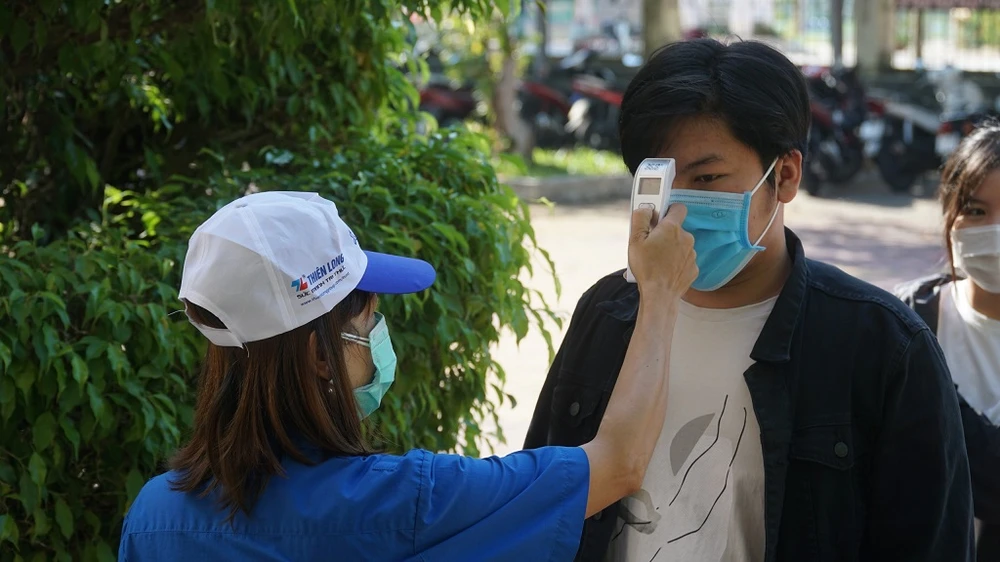 Thí sinh được đo thân nhiệt trước khi vào phòng thi. Ảnh: BÙI TOÀN