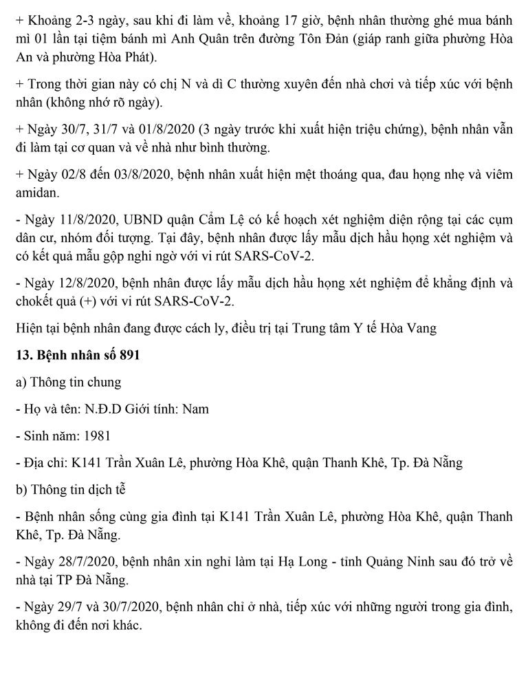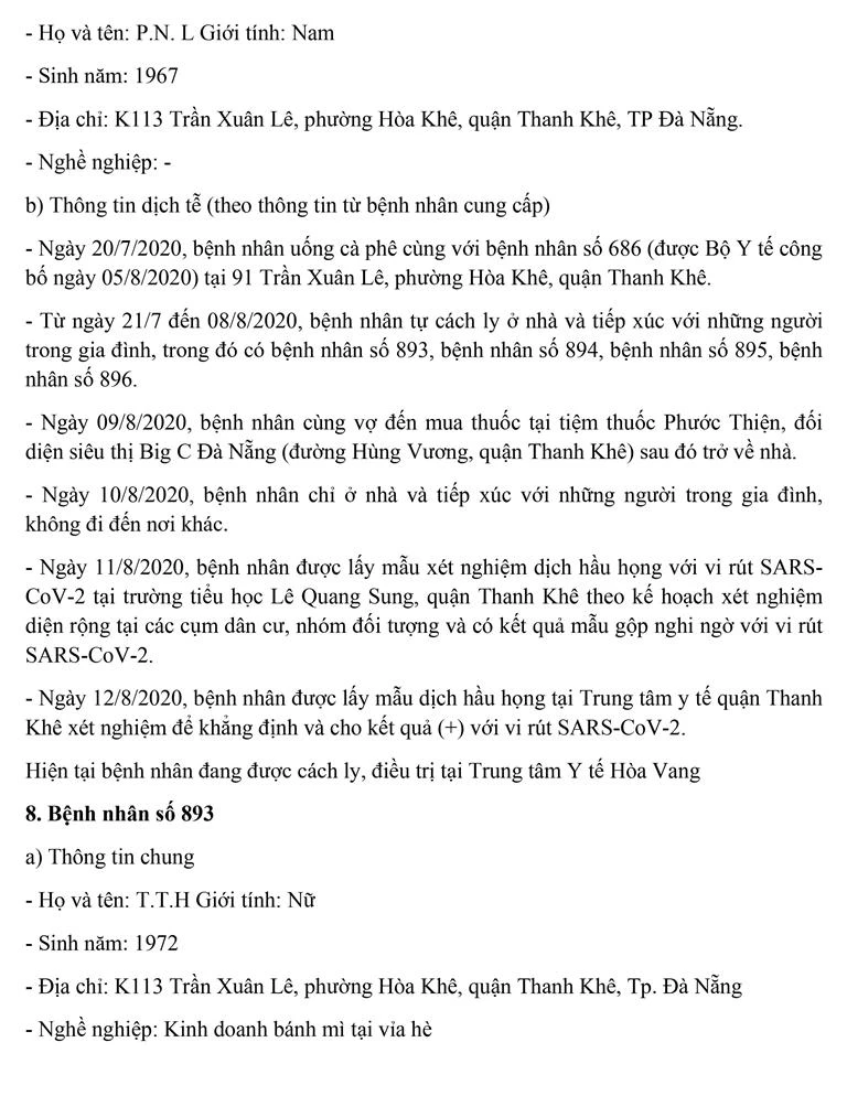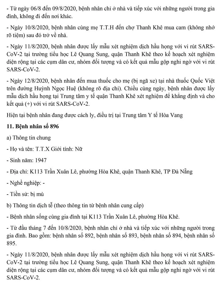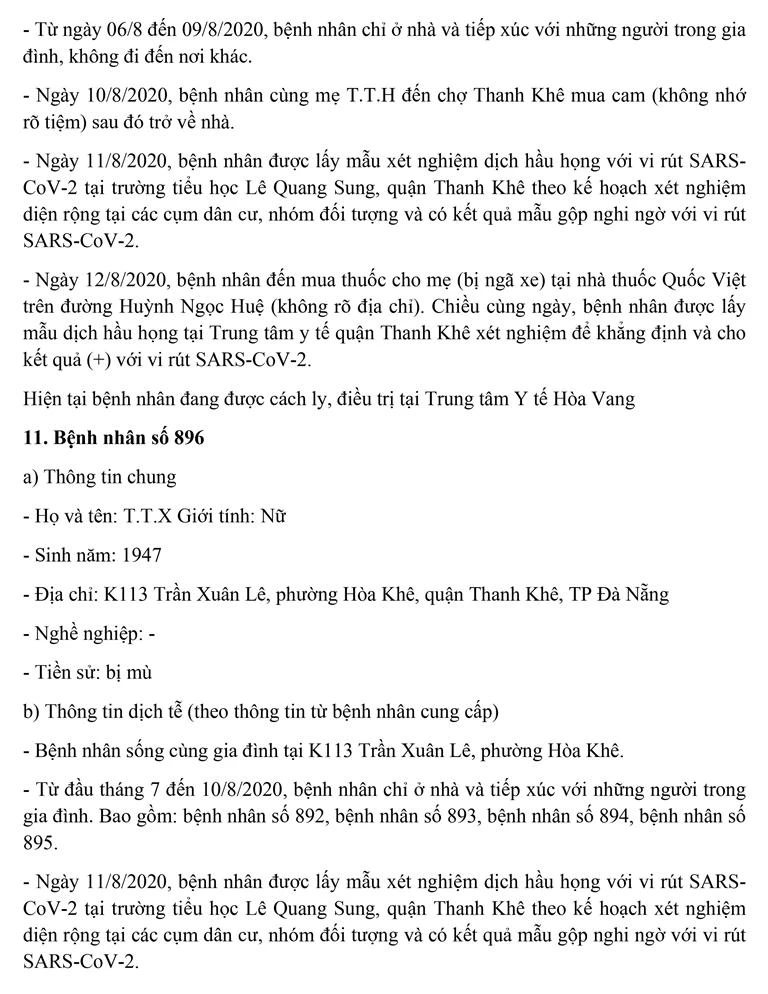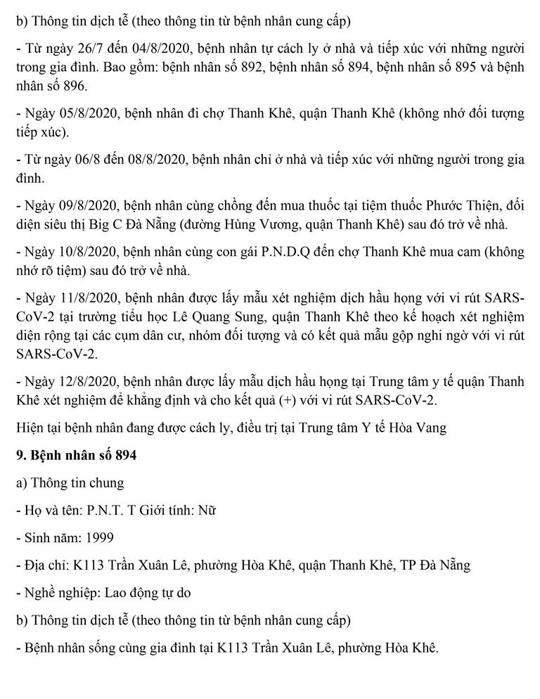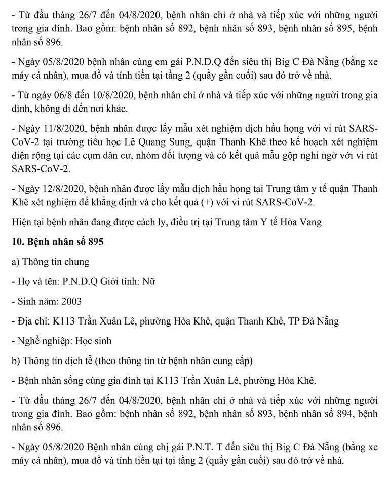 Đặc biệt trong số này, các bệnh nhân số 892, 893, 894, 895, 896 là những người trong cùng một gia đình, ngụ K113 Trần Xuân Lê (phường Hòa Khê, quận Thanh Khê, Đà Nẵng).