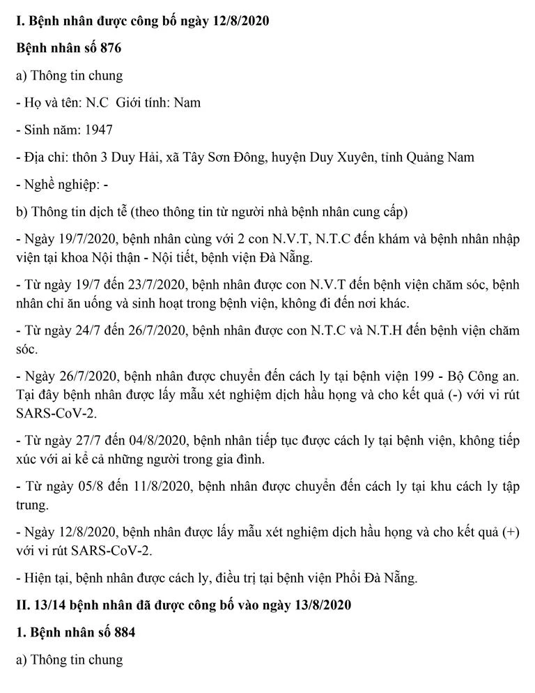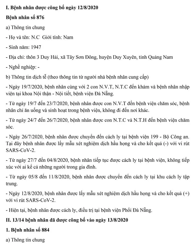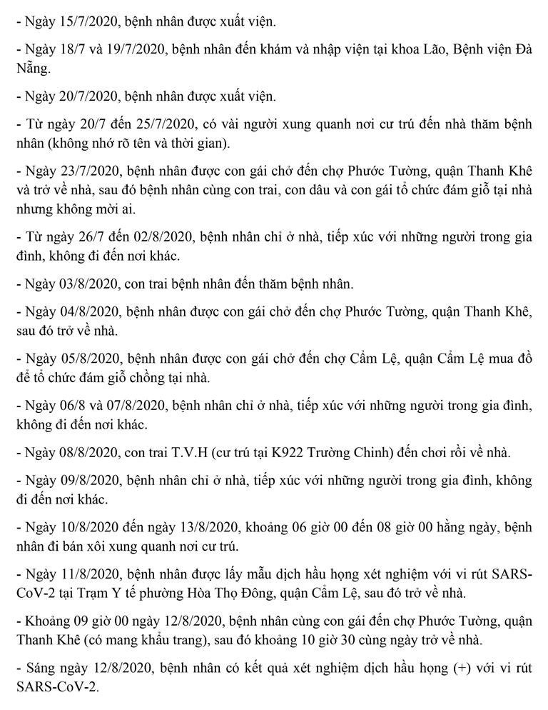 Chiều 14-8, Ban chỉ đạo Phòng chống dịch COVID-19 TP Đà Nẵng cung cấp thông tin về kết quả điều tra, giám sát, xử lý đối với một trường hợp bệnh nhân mắc COVID-19 tại TP được công bố ngày 12-8 và 13/14 trường hợp bệnh nhân đã được công bố trong ngày 13-8.