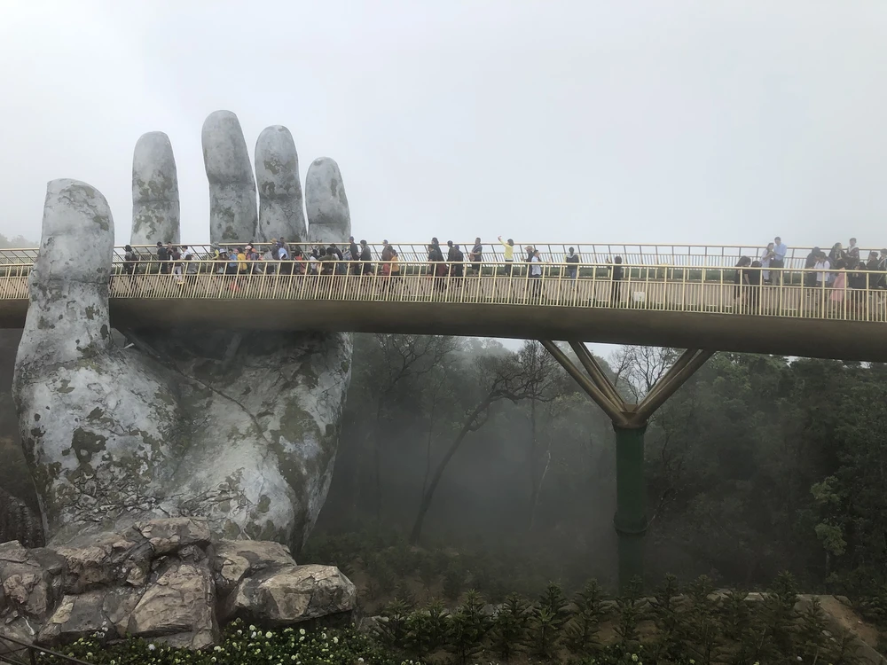 Cầu Vàng Đà Nẵng trở thành điểm đến ấn tượng của Việt Nam khi lượng khách quốc tế dồn dập tới với mong muốn để được check in tại đây. Ảnh: HOÀI AN.