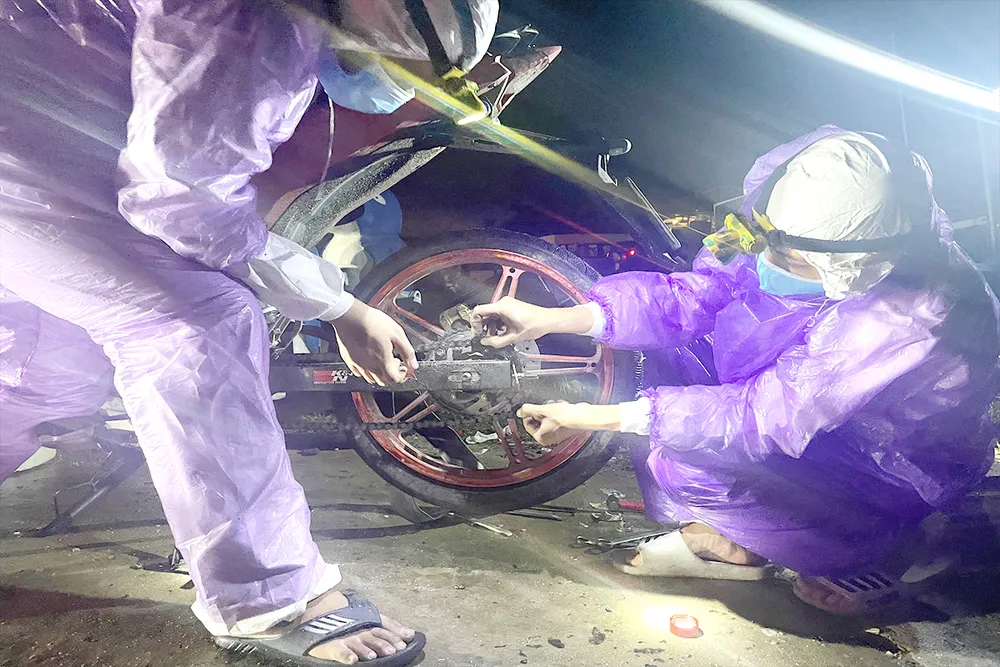 Dầm mưa cứu hộ xe máy trong đêm. Ảnh: BT