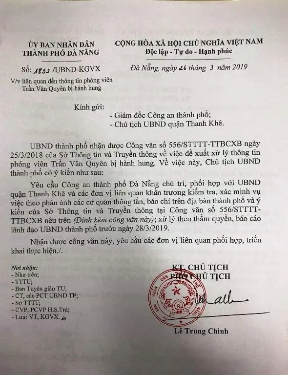 Ngày 26-3, thực hiện ý kiến chỉ đạo của Chủ tịch UBND TP Đà Nẵng, ông Lê Trung Chinh, Phó Chủ tịch UBND TP Đà Nẵng, đã ký văn bản gửi Giám đốc công an TP và Chủ tịch UBND quận Thanh Khê liên quan đến thông tin phóng viên Trần Văn Quyên (bút danh Vĩnh Quyên) báo Người Lao Động bị hành hung.