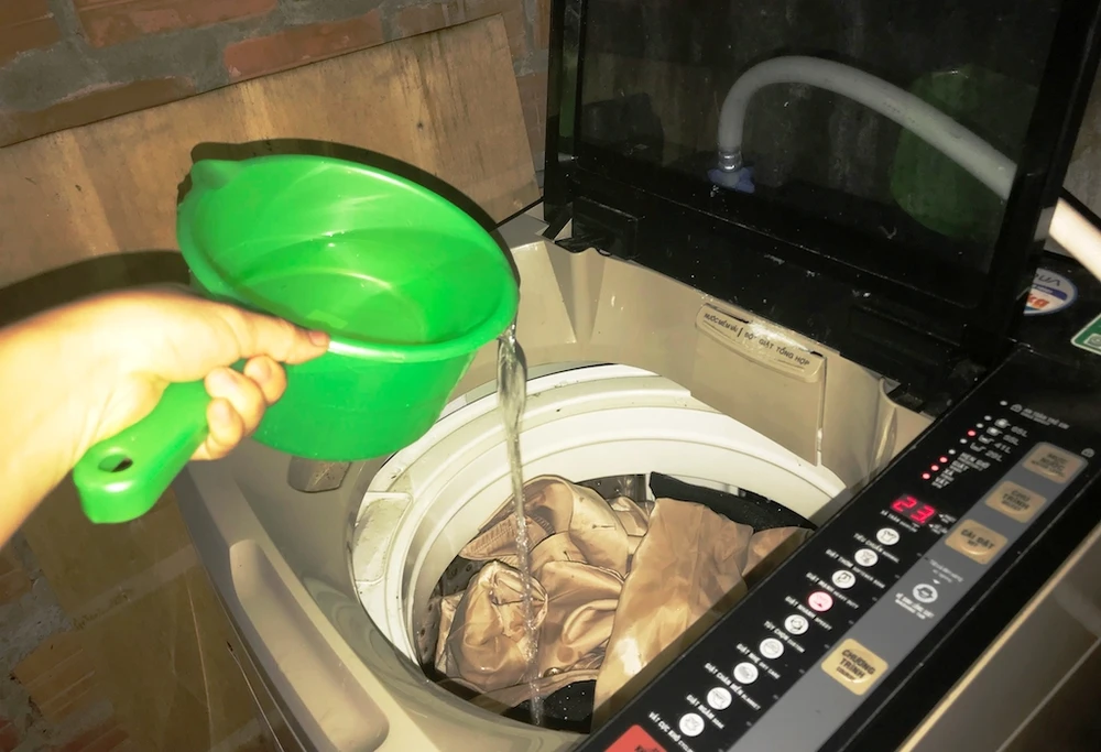 Do thiếu nước nên người dân phải múc nước đổ thêm vào máy giặt. Ảnh: HẢI HIẾU