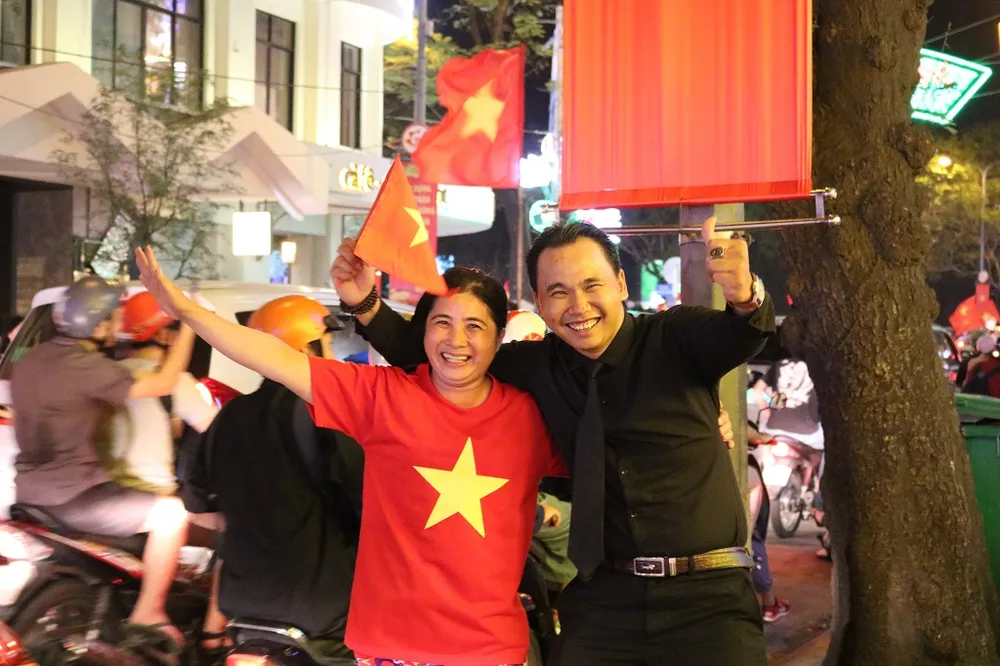 Chiến thắng quá thuyết phục của đội nhà đã mang đến quá nhiều cảm xúc trong hàng triệu trái tim người Việt. Dọc con đường Hoàng Sa (TP.HCM) tiếng trống, tiếng nồi niêu xoong chảo lấn át cả một góc phố. Ở đó, dễ thấy hình ảnh của những thanh niên vì quá vui sướng mà ôm chầm lấy bất kỳ ai bên cạnh mình.