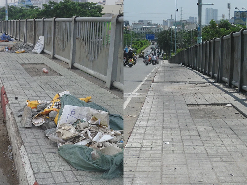 Những người ý thức kém đã đổ rác ngay đường bộ hành, làm cản trở lối đi dành cho người đi bộ trên cầu (ảnh 1). Sau khi báo đăng, cơ quan chức năng đã dọn rác và xà bần trên cầu (ảnh 2).