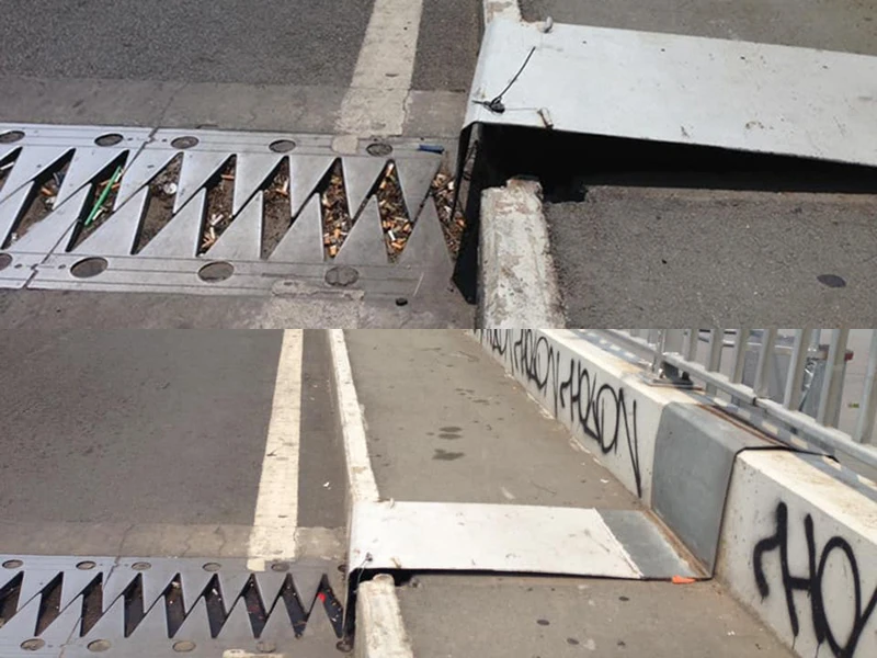 Các đinh ốc bắt vào tấm thép không còn nên tấm thép nhô lên mặt đường, rất nguy hiểm cho người đi đường (ảnh 1).