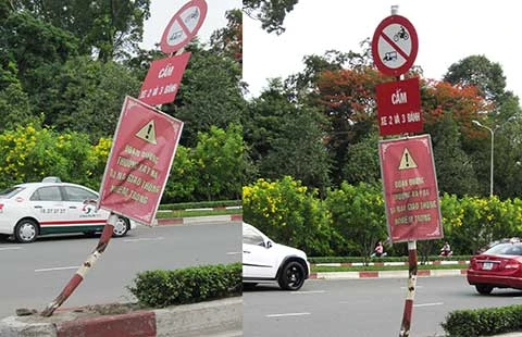 Ngay sau khi báo đăng, cột biển báo đã được dựng lại, tuy nhiên nhìn vào vẫn thấy chưa đẹp mắt (ảnh phải).