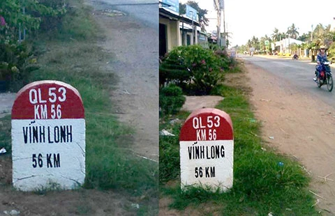Sau khi báo đăng tin, các cơ quan chức năng đã sửa lại lỗi trên cột mốc từ VĨNH LONH thành VĨNH LONG (ảnh).