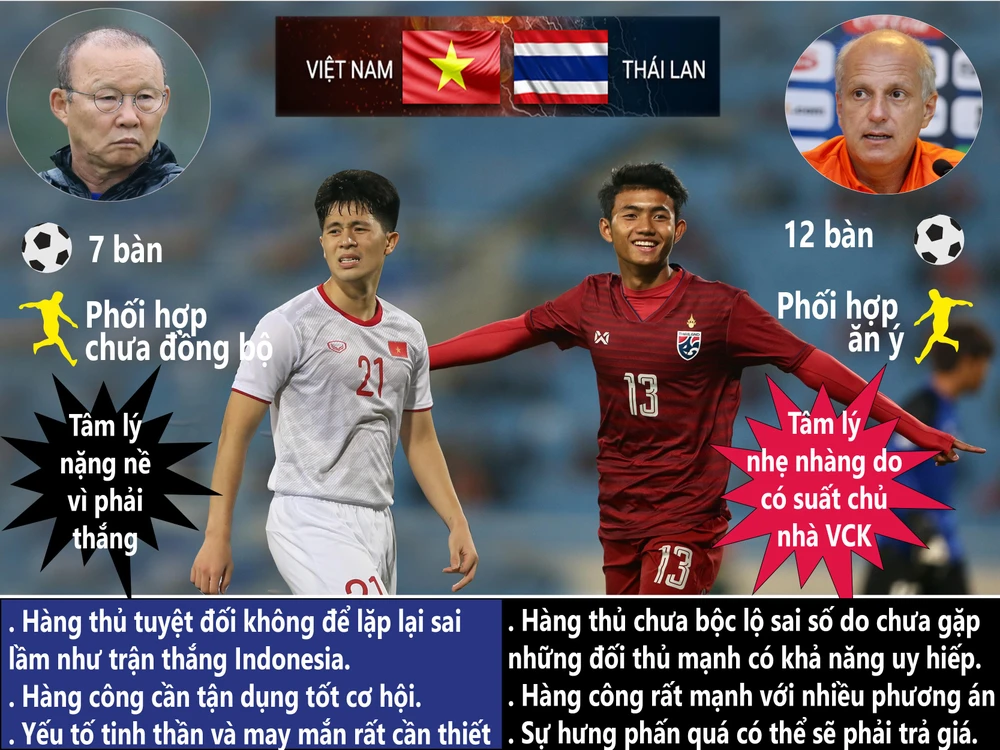 Tuyến trên Thái Lan đang hưng phấn cao với 12 bàn thắng sau hai trận. Ngược lại với 7 bàn thắng nhưng hàng thủ Việt Nam đang gặp nhiều khó khăn dù cơ hội tạo ra không ít. Những chân sút như Hoàng Đức, Đức Chinh nếu chắt chiu hơn và giải quyết tốt các cơ hội và làm được điều đó sớm thì chính Thái Lan mới là đội phải chơi theo ý đồ của chúng ta.