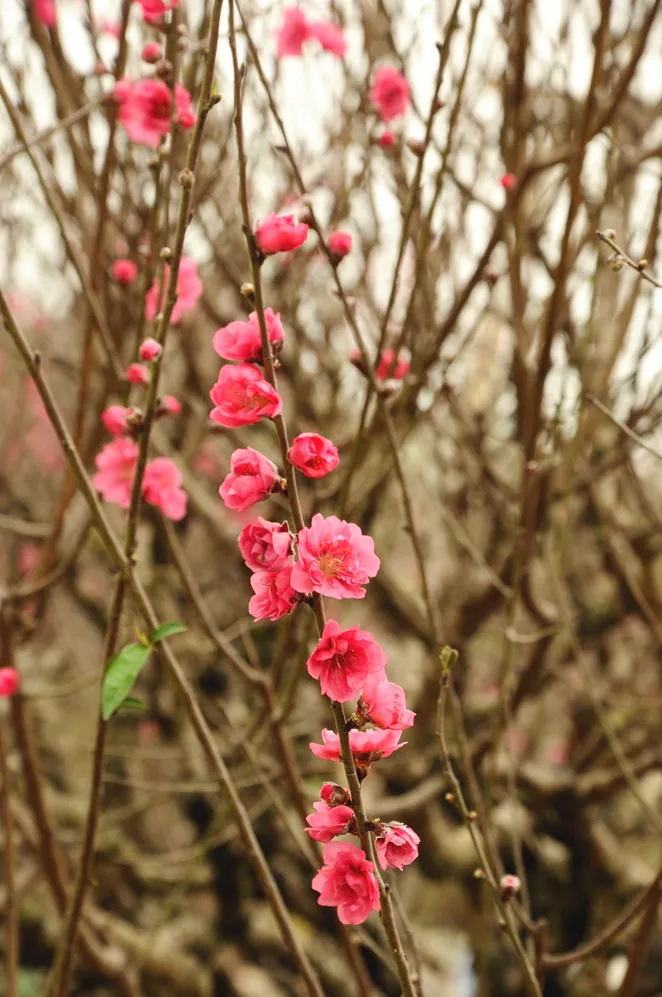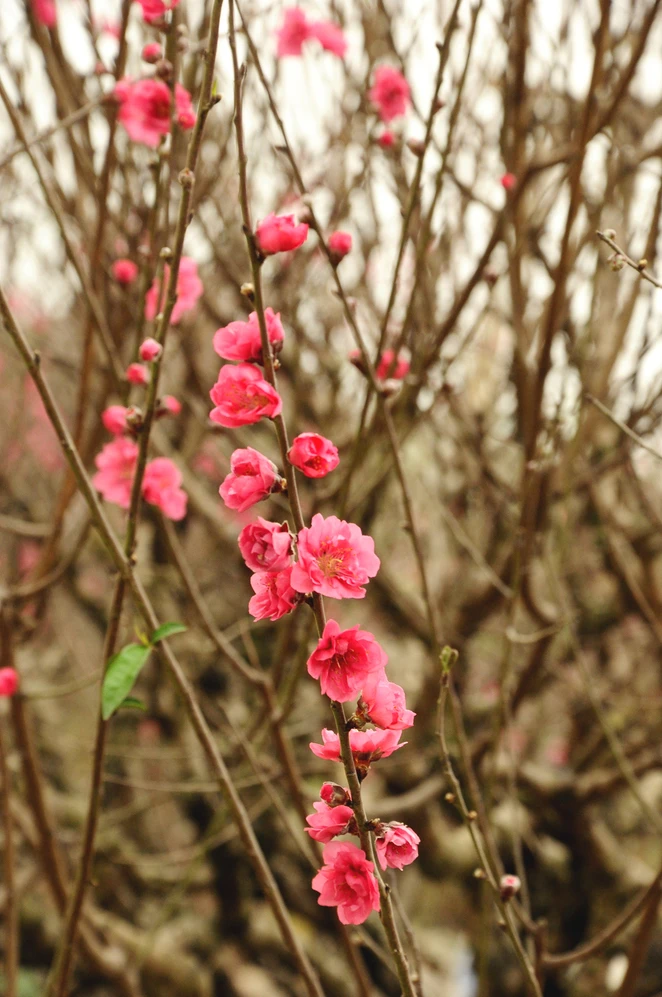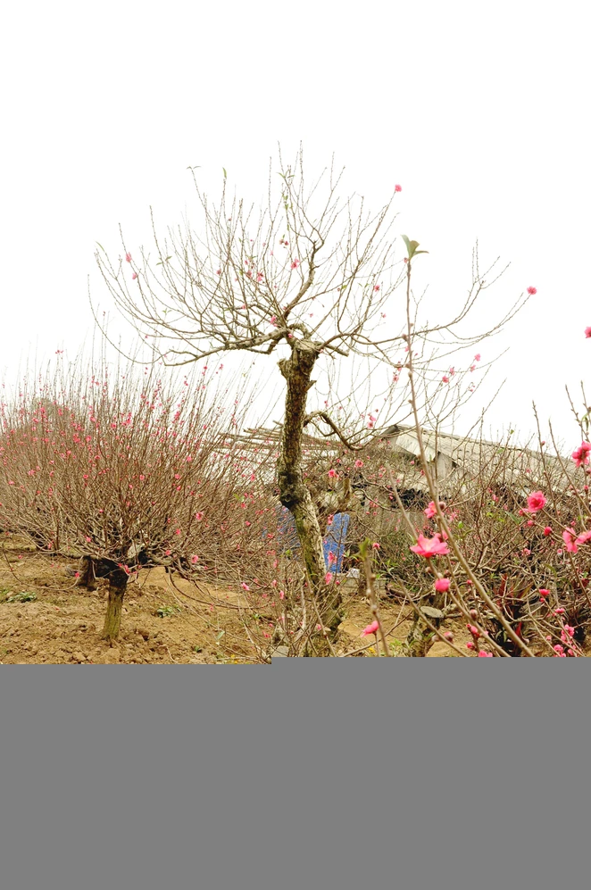 Đào đã nở trong nắng ấm vài hôm trước vẫn còn rất thắm sắc. Đào được các nhà vườn cẩn thận hãm nụ để hoa bừng nở đúng dịp Tết đến xuân về trong hai tuần nữa.