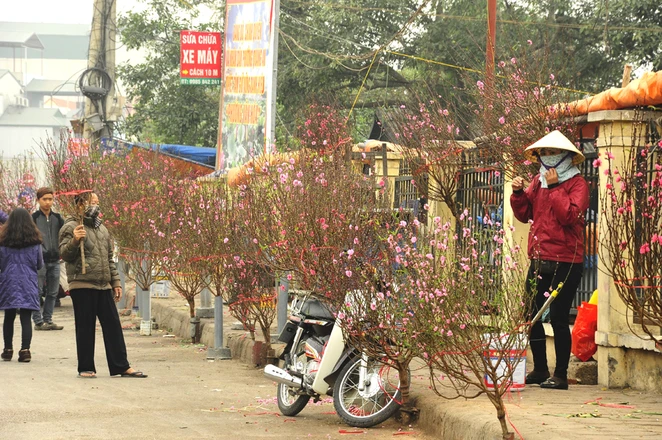 Sau những ngày nắng ấm, hoa đào đã bắt đầu khoe sắc trên khắp các vườn hoa dọc sông Hồng phía Hồ Tây. Hoa nở sớm nhất là đào bên cổng các khu vườn, những gốc đào không bao giờ bán của các gia đình.