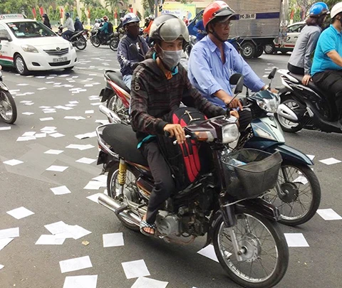 Tờ rơi được phát tán ở giao lộ Lý Thái Tổ - Nguyễn Tri Phương - Ba Tháng Hai (trên) và chữ viết khó đọc trong tờ rơi. Ảnh: HƯƠNG TRÀ