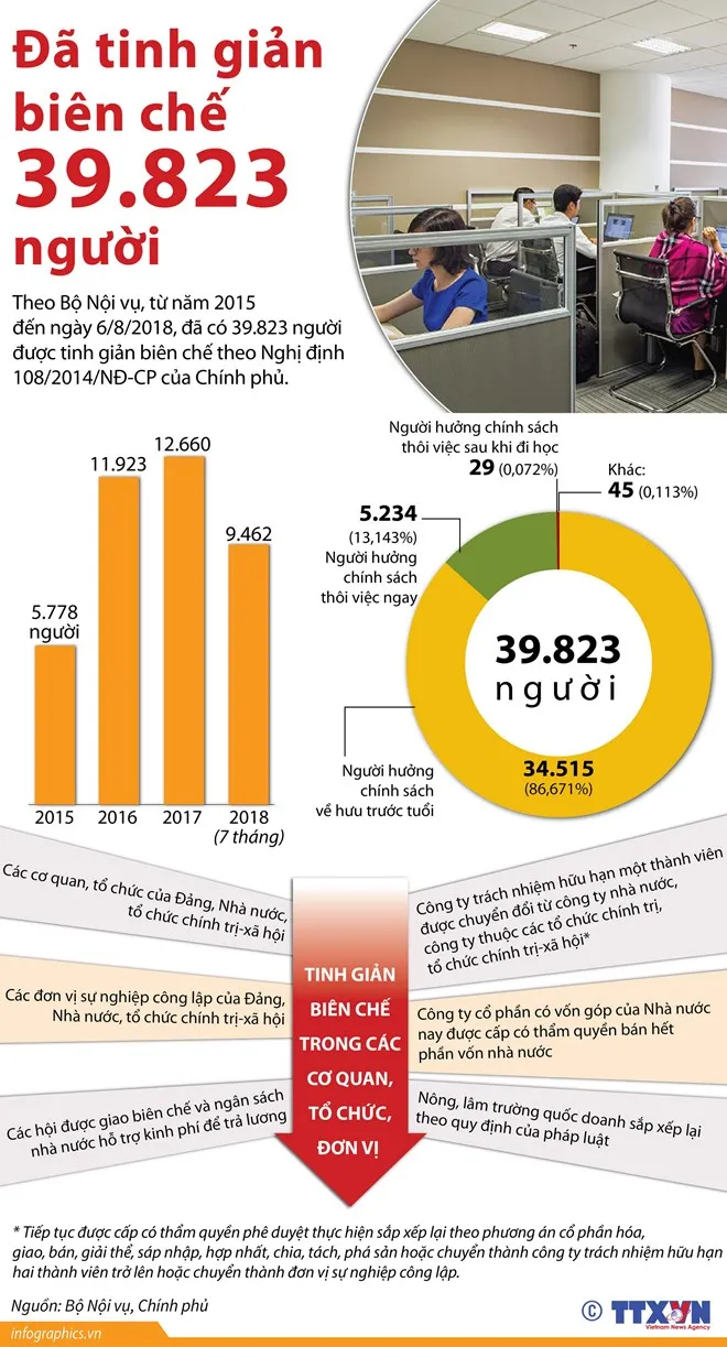 Theo Bộ Nội vụ, từ năm 2015 đến ngày 6-8-2018, đã có 39.823 người được tinh giản biên chế theo Nghị định 108/2014 của Chính phủ.