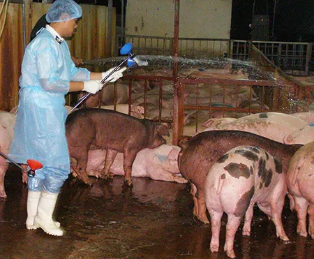 Nhân viên Chi cục Thú y TP.HCM lấy nước tiểu heo để xét nghiệm chất cấm. Ảnh: TRẦN NGỌC