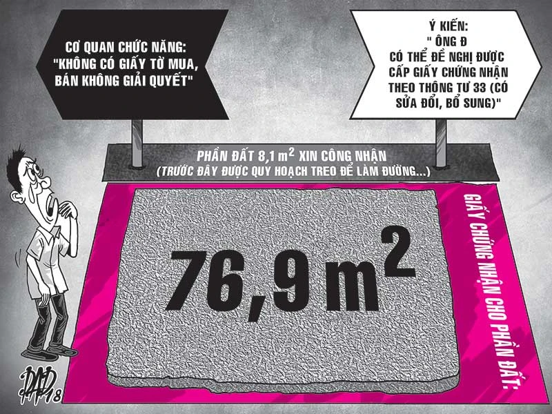 Ông Đức chia sẻ: “Tôi mua trọn thửa, trọn nhà thì về lý tôi là chủ của thửa đất này. Tôi muốn làm cho hợp pháp trọn thửa luôn rồi mới cất nhà vì mỗi lần làm giấy là một lần khó. Nhà nước quy hoạch nữa thì tôi chịu, còn xóa quy hoạch thì tôi xin mua lại đất là hợp lý chứ. Tất nhiên tôi sẽ thực hiện đầy đủ nghĩa vụ tài chính theo quy định. Trước đây là quy hoạch đường giao thông làm sao mua bán được mà có giấy chuyển nhượng?”.