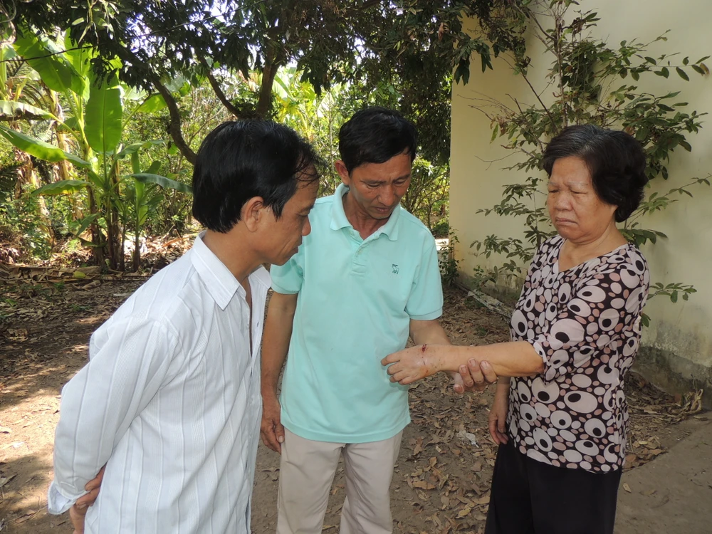 Vết thương trên cánh tay của bà Phi do chính chú khỉ mình nuôi tấn công, đang có dấu hiệu nhiễm trùng. Ảnh: T.PHÚC