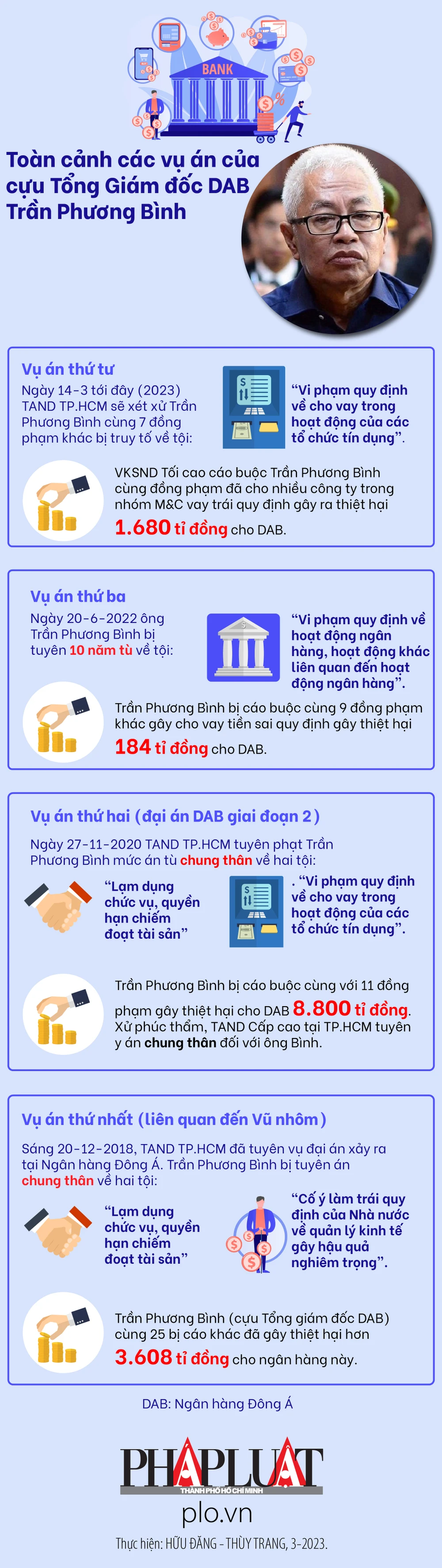(PLO)- Tính đến nay, ông Trần Phương Bình đã nhận hai án chung thân, một án 10 năm tù; tính thêm vụ án thứ tư mà TAND TP.HCM chuẩn bị xét xử sơ thẩm thì tổng thiệt hại mà ông Bình bị cáo buộc gây ra cho DAB là hơn 14.000 tỉ đồng.