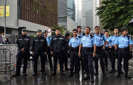 Cảnh sát canh gác trước văn phòng đặc khu trưởng Hong Kong. Ảnh: REUTERS