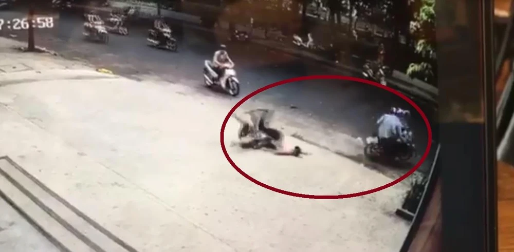 Hình ảnh từ clip cho thấy lúc này người phụ nữ và bạn đang đi bộ trên lề đường. Trên vai người này có đeo túi xách. Bất thình lình, hai thanh niên chạy xe máy từ phía sau áp sát rồi giật phăng chiếc túi trên vai người phụ nữ.
