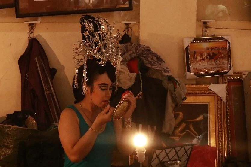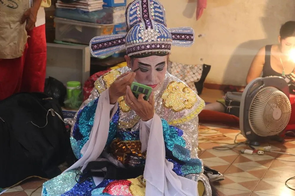 Các diễn viên của đoàn hát bội Ngọc Khanh tất bật vẽ mặt, hóa trang cho vở diễn.