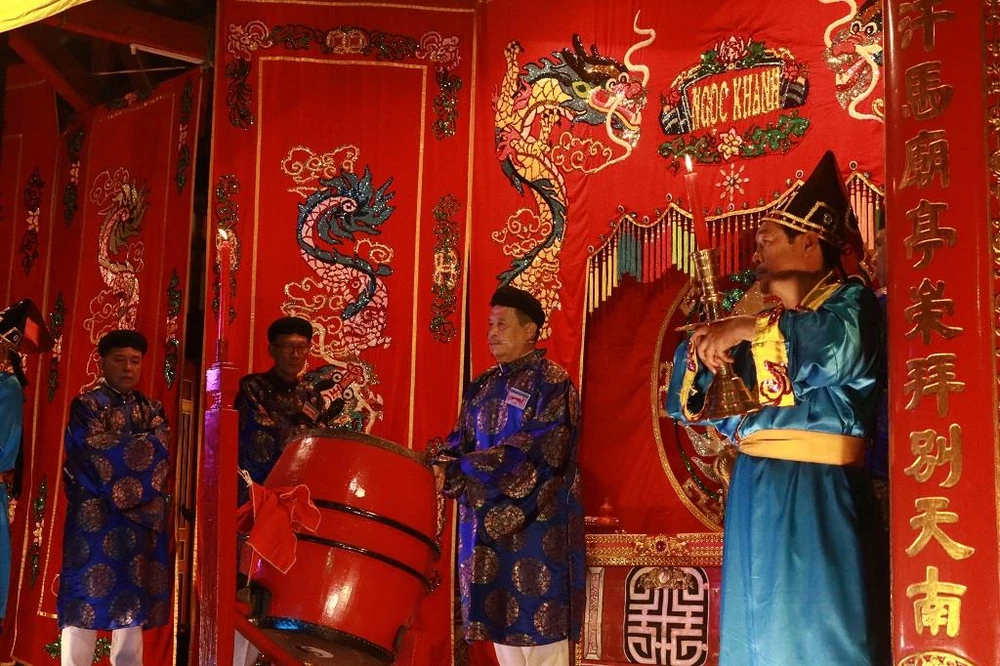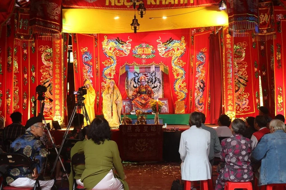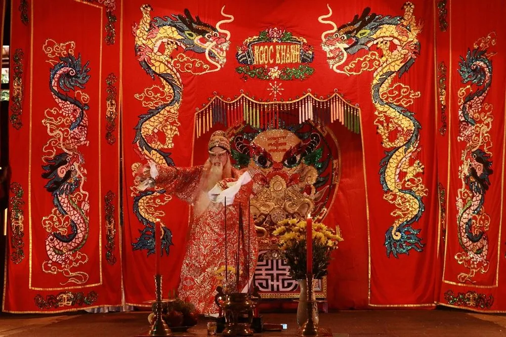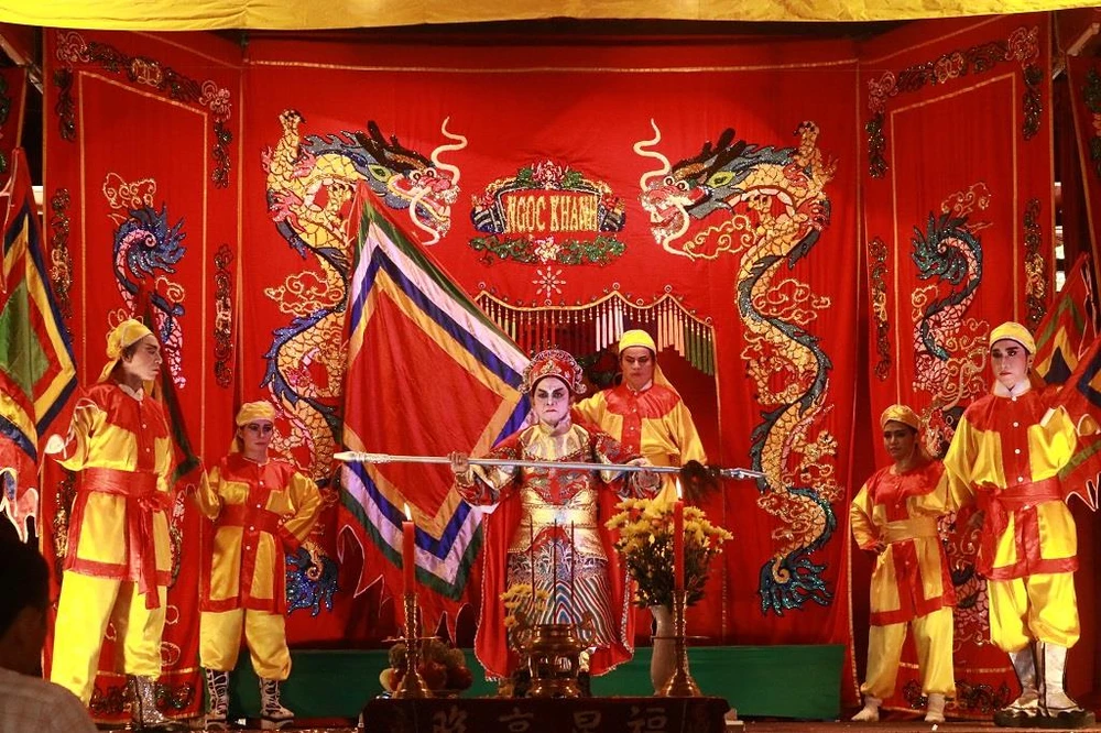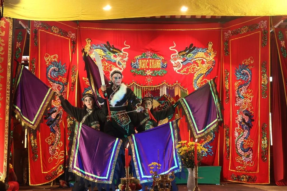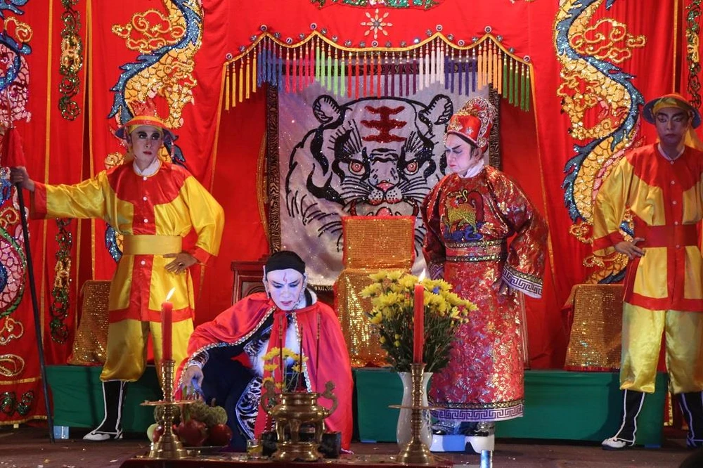 Người dân chăm chú theo dõi các nghệ sĩ biểu diễn hát bội, một loại hình nghệ thuật truyền thống đặc sắc của dân tộc.