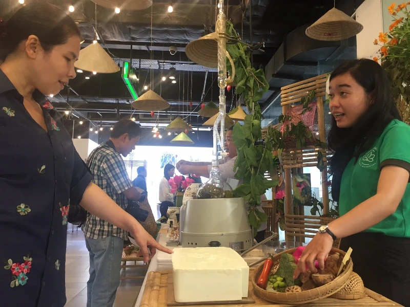 Tại buổi kết nối các nhà vườn, DN Đồng Tháp đã giới thiệu về sản phẩm chế biến đặc sắc từ mãng cầu xiêm như mãng cầu xiêm tươi sấy dẻo, trà trái cây, mãng cầu xiêm… Sản phẩm trà lá sen với công nghệ sấy sau đó được ướp chân không giúp giữ được những gì tinh túy của sen.