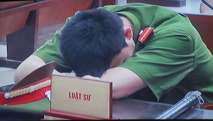 Một đồng chí cảnh sát bảo vệ tranh thủ nghỉ tí lúc Tòa chưa bắt đầu làm việc. Ảnh: TN