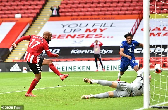 Phút 18, McBurnie sút bóng khó chịu chạm cầu thủ Chelsea, thủ thành Arrizabalaga dù kịp vươn tay đẩy bóng ra nhưng McGoldrick nhanh chân có mặt sút bồi vào lưới trống mở tỉ số 1-0 cho đội chủ nhà.