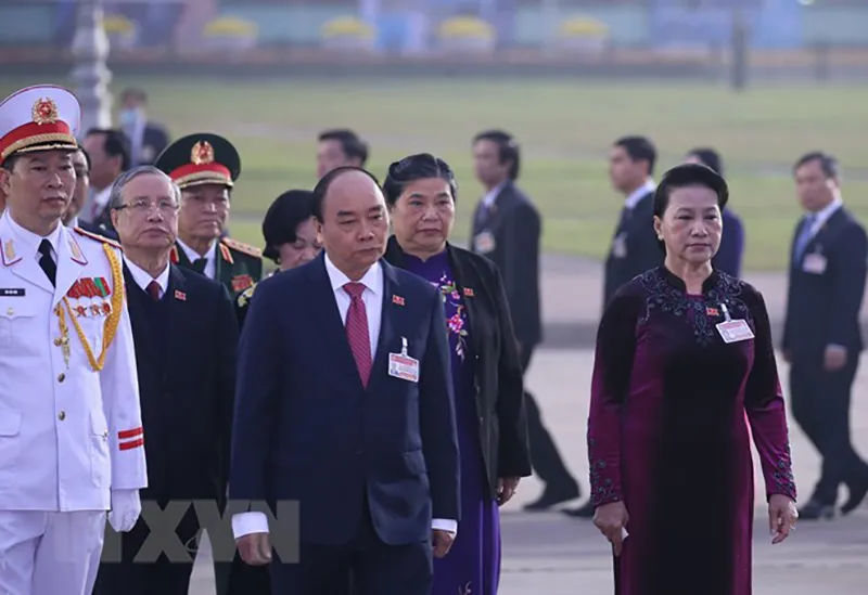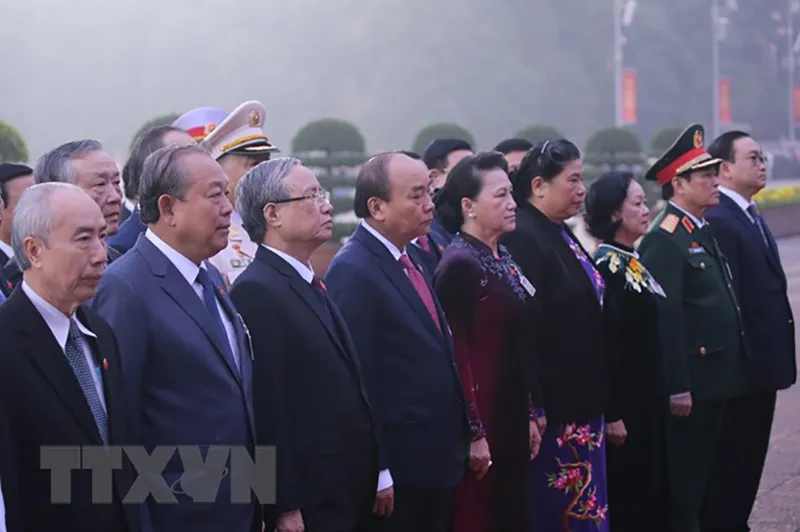 Các lãnh đạo Đảng, Nhà nước cùng đại biểu dự Đại hội XIII của Đảng đặt vòng hoa và vào Lăng viếng Chủ tịch Hồ Chí Minh. Ảnh: TTXVN