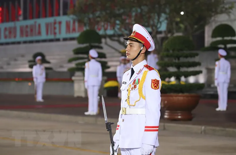 Đội nghi lễ triển khai đội hình trên quảng trường Ba Đình, sáng 25-1. Ảnh: TTXVN