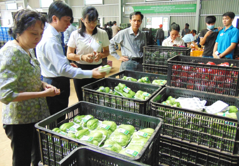 Bà Phạm Khánh Phong Lan (bìa trái) tham quan điểm sơ chế rau củ của VinEco. Ảnh: TRẦN NGỌC