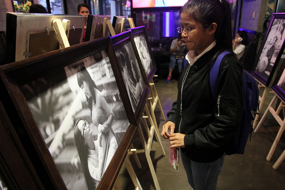 Khách tham quan triển lãm "Vu Lan nhớ mẹ" của nhiếp ảnh gia Thành Xuân Anh. Ảnh: HOÀNG GIANG