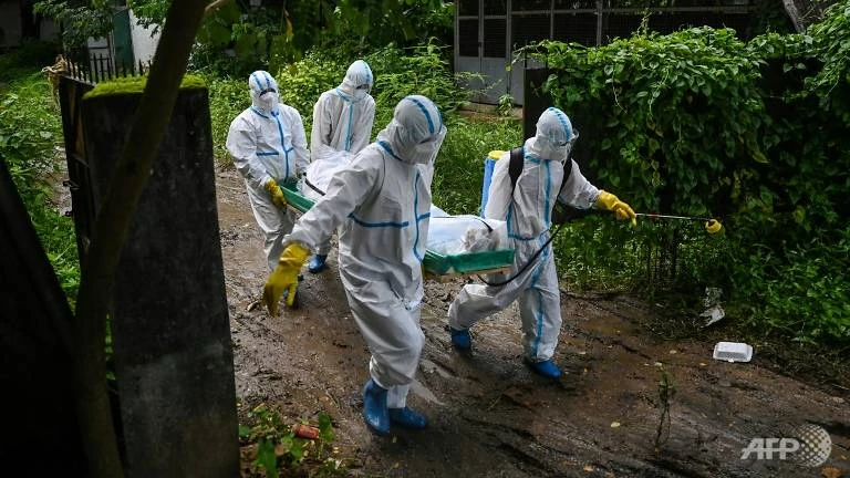 Tình nguyện viên Myanmar khiêng xác một người chết vì COVID-19 đến nghĩa trang ở TP Yangon, Myanmar. Ảnh: AFP