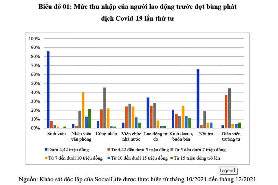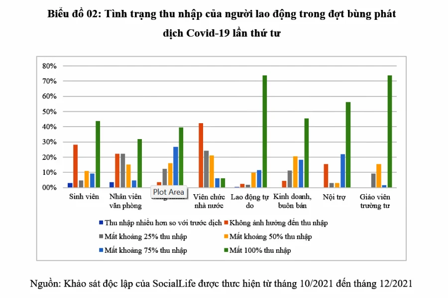 Khi đại dịch bùng phát, theo số liệu khảo sát của chúng tôi có tới 82% trên tổng số 850 người được hỏi cho biết kinh tế lâm vào tình trạng khó khăn tài chính. Nguồn thu nhập ít ỏi của họ dường như mất trắng, trong đó nhóm chịu ảnh hưởng nhất chính là nhóm lao động tự do (73,7%) và giáo viên tư thục (73,8%) là nhóm chịu ảnh hưởng nặng nề nhất.