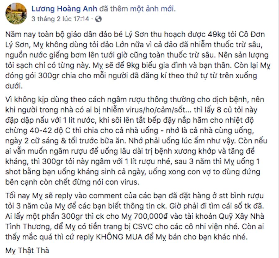 Cụ thể, vào ngày 3-2, chủ tài khoản Facebook Lương Hoàng Anh đã đăng thông tin “Năm nay toàn bộ giáo dân đảo bé Lý Sơn thu hoạch được 49 kg tỏi Cô Đơn Lý Sơn, Mỵ không dùng tỏi đảo Lớn nữa vì cả đảo đã nhiễm thuốc trừ sâu, nguồn nước giếng bơm lên tưới giờ cũng toàn thuốc trừ sâu. Nên sản lượng tỏi sạch chỉ có từng này. Mỵ sẽ để 9 kg biếu gia đình và bạn thân. Còn lại Mỵ đóng gói 300 g chia cho mỗi người đã đăng ký theo thứ tự từ trên xuống dưới”.