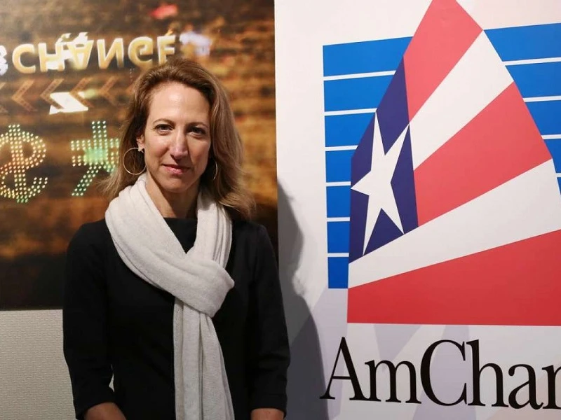 Bà Tara Joseph - Trưởng Phòng Thương mại Mỹ tại Hong Kong - chụp hình bên cạnh logo của văn phòng này. Ảnh: SCMP