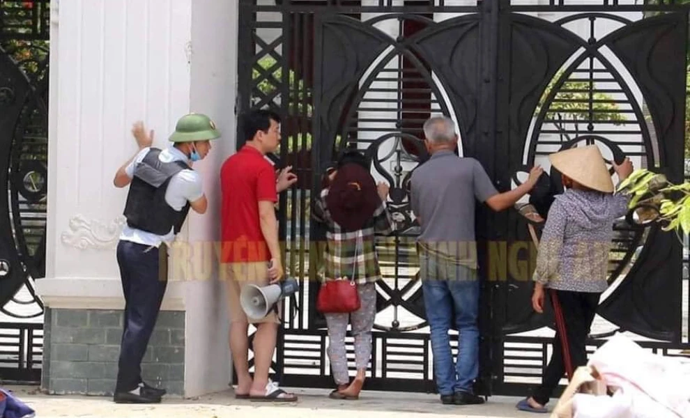 Đại tá Phạm Hoài Nam (thứ 2 từ phải sang) cùng chị gái, người thân của Phú và cảnh sát đứng trước cổng căn biệt thự kêu gọi, vận động, thuyết phục Phú ra đầu thú.