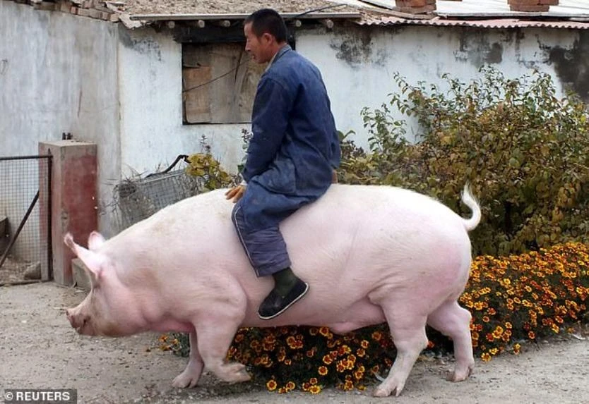 Trong một trang trại nuôi heo khu vực phía nam TQ, một người lớn có thể dễ dàng leo lên lưng một con heo tại đây và cưỡi đi khắp nơi như cưỡi ngựa.