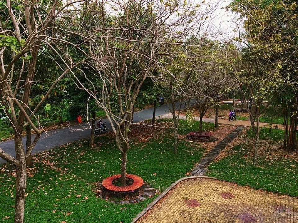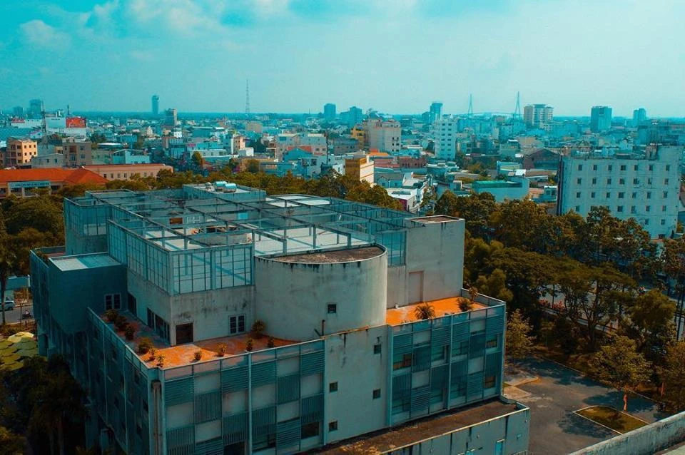 Thư viện trường từ trên cao nhìn xuống như một ốc đảo được bao bọc bởi cây xanh.
