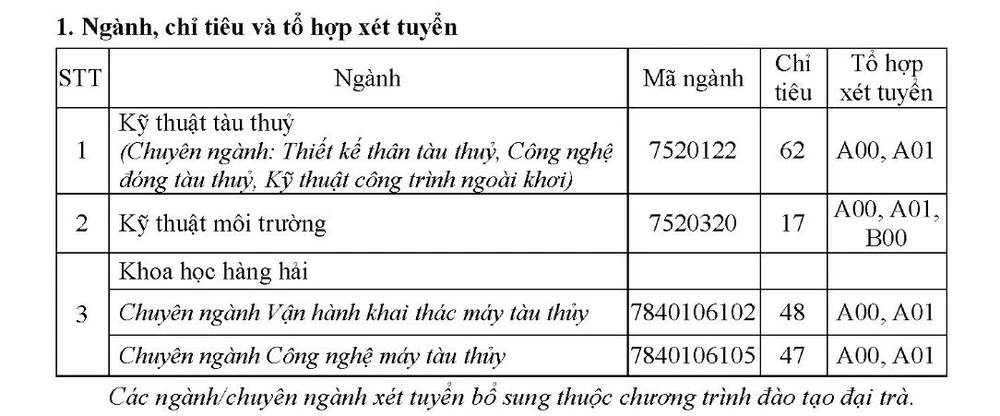 Theo đó, ba ngành của trường sẽ xét tuyển thêm 174 chỉ tiêu. Trong đó, ngành kỹ thuật tàu thủy xét tuyển số chỉ tiêu cao nhất là 62 chỉ tiêu. Ngành khoa học hàng hải, chuyên ngành vận hành khai thác máy tàu thủy xét 48 chỉ tiêu, chuyên ngành công nghệ máy tàu thủy xét 47 chỉ tiêu. Ngành kỹ thuật môi trường cũng xét thêm 17 chỉ tiêu.