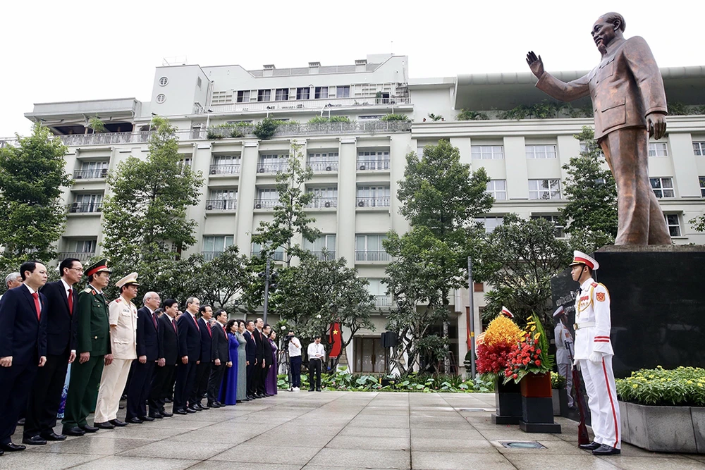 Đoàn đại biểu dâng hoa lên Tượng đài Bác Hồ. Ảnh: HOÀNG GIANG