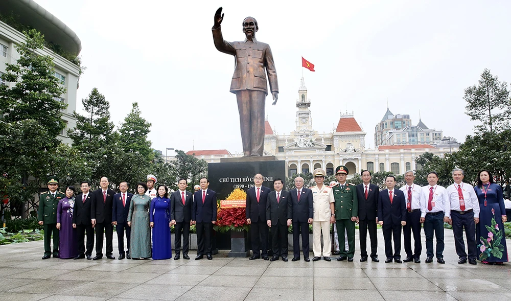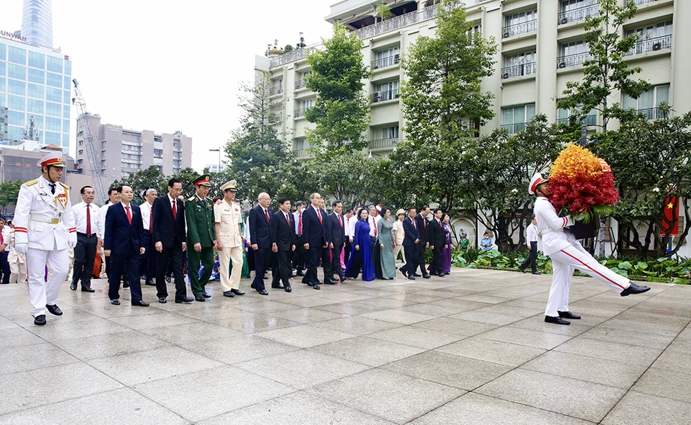 Đoàn đại biểu do Bí thư Thành uỷ TP.HCM Nguyễn Thiện Nhân đến dâng hoa tưởng nhớ Chủ tịch Hồ Chí Minh tại Công viên Tượng đài Bác Hồ. Ảnh: HOÀNG GIANG