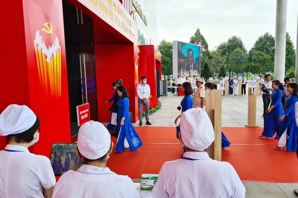 Trước sảnh Trung tâm hội nghị triển lãm, ban tổ chức bố trí lực lượng y tế kiểm tra thân nhiệt, yêu cầu các đại biểu rửa tay sát khuẩn trước khi vào dự Đại hội, đảm bảo công tác phòng, chống dịch COVID-19.