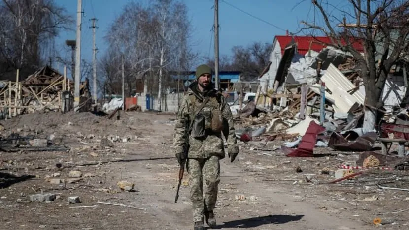 Một binh sĩ Ukraine có mặt tại một ngôi làng bị Nga phá hủy ở miền đông Kiev vào ngày 21-3. Ảnh: REUTERS