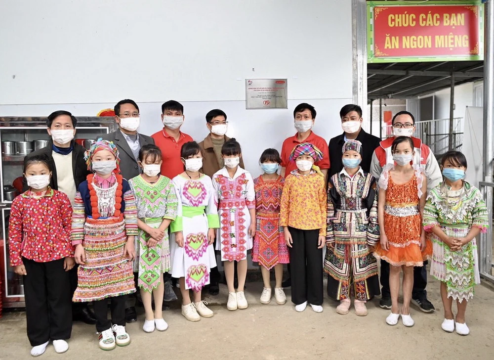Đại diện Dai-ichi Life Việt Nam cùng các thầy cô và các em học sinh trong buổi lễ khánh thành công trình cải tạo Trường PTDT NT Tiểu học Xín Cái, Hà Giang
