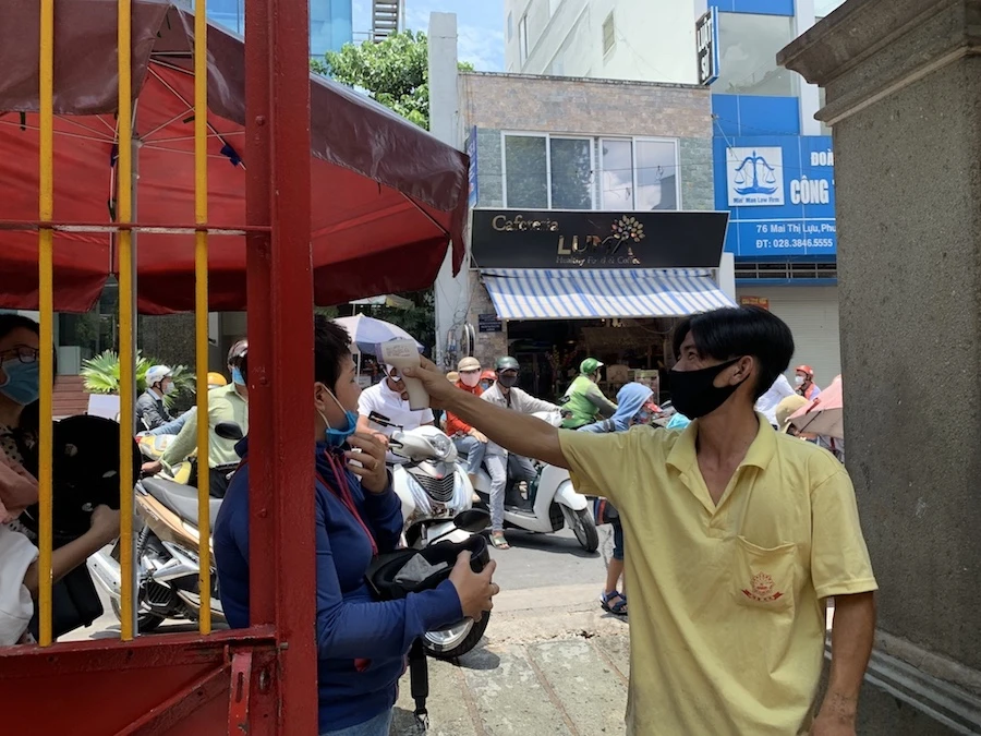 Phật tử trước khi vào chùa đều được đo thân nhiệt. Số lượng Phật tử trong chùa Phước Hải luôn được giới hạn khoảng 20 Phật tử và nhắc nhở lễ bái nhanh chóng. Ảnh: QT