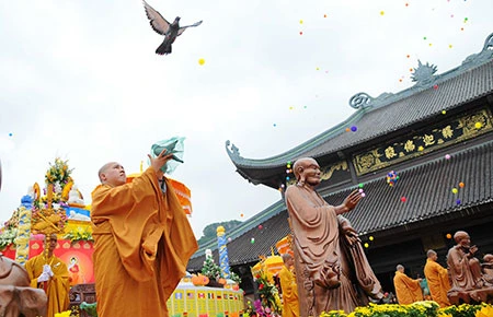Lễ thả chim bồ câu cầu nguyện cho thế giới hòa bình tại nghi thức “Tắm Phật” trong đại lễ. Ảnh: TTXVN