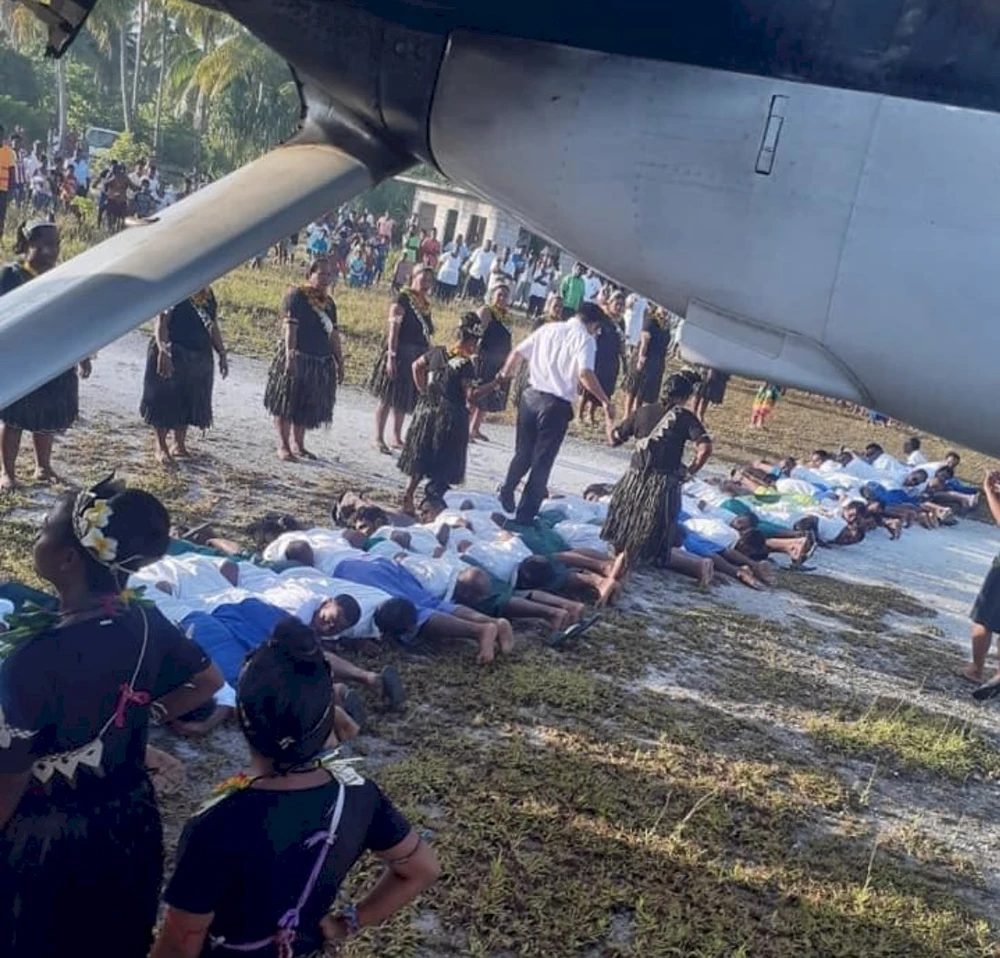 Bức ảnh được chụp trên đảo Marakei của Kiribati, cho thấy một hàng cư dân địa phương nằm úp mặt xuống đất để làm thành tấm thảm người cho đại sứ Trung Quốc bước lên với sự giúp đỡ của hai phụ nữ bản địa ở hai bên.