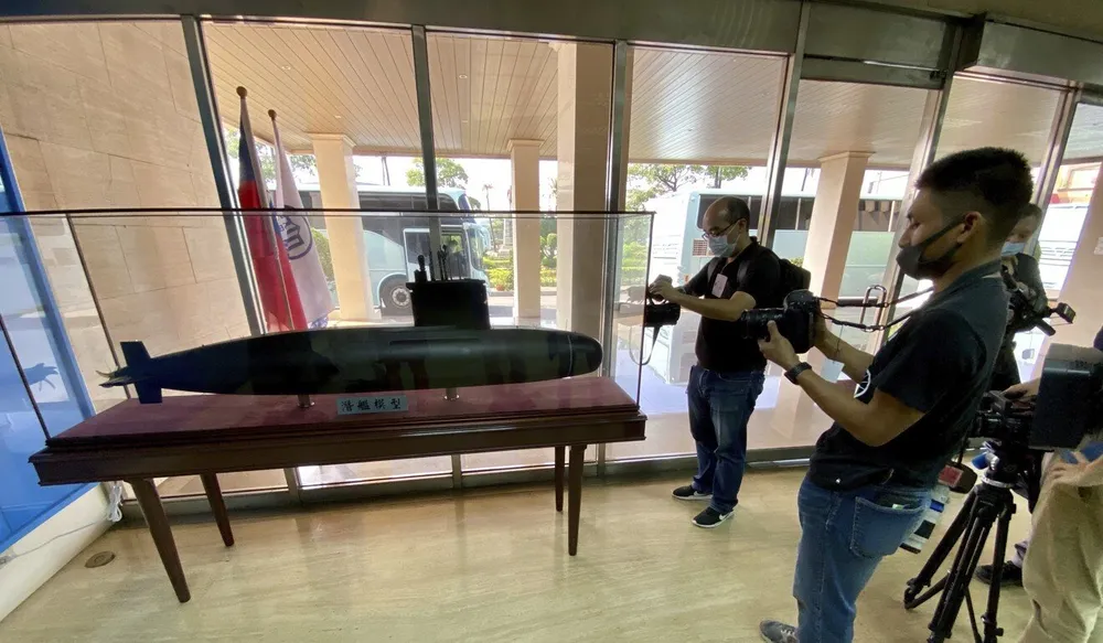 Một mô hình tàu ngầm được trưng bày tại xưởng đóng tàu CSBC ở thành phố Cao Hùng. Ảnh: AP