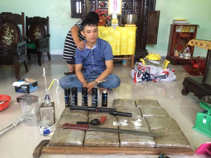 Tiến hành khám xét tại nhà Bảo, Công an phát hiện trong phòng ngủ có 14 bánh cần sa trọng lượng 14kg, 17,586 gam heroin, 7,82 gam ma túy tổng hợp dạng đá, 90 triệu đồng cùng với vũ khí là roi điện, mã tấu và một khẩu súng giả.